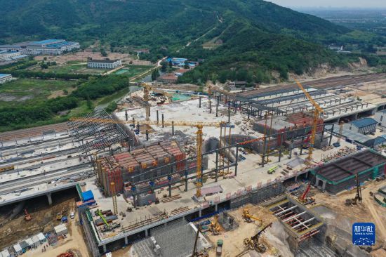 6月26日拍攝的南沿江鐵路江陰站站房主體結(jié)構(gòu)封頂施工現(xiàn)場(chǎng)(無(wú)人機(jī)照片)。