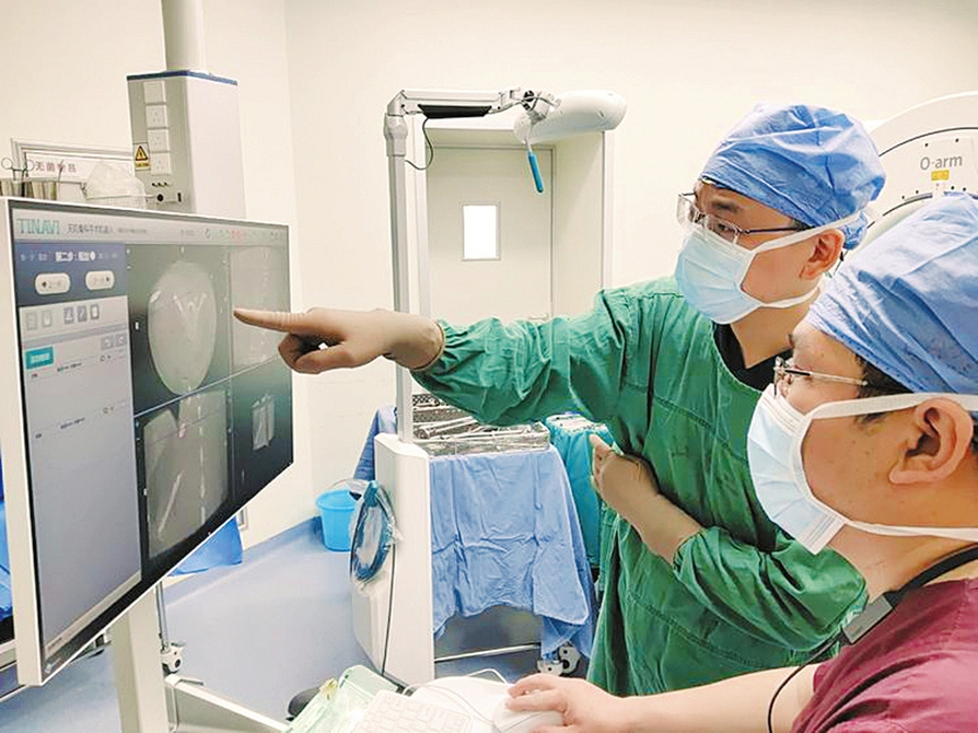 近日,山西醫(yī)科大學(xué)第二醫(yī)院趙斌教授、趙軼波副主任醫(yī)師團隊完成省內(nèi)首例脊柱機器人導(dǎo)航可視化置釘手術(shù),耗時2小時,出血量僅50毫升,患者術(shù)后恢復(fù)良好,第3天可下床活動。手術(shù)在機器人的輔助下,精準(zhǔn)有效置入椎弓根螺釘,縮短了手術(shù)時間,有效控制術(shù)中出血,顯著減少了放射線對醫(yī)生和患者的輻射,極大提高了手術(shù)效率和安全性。(周慧芳 高志國圖/文)