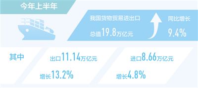 本報北京7月13日電 (記者杜海濤)據(jù)海關(guān)統(tǒng)計,今年上半年我國貨物貿(mào)易進出口總值19.8萬億元,同比增長9.4%。其中,出口11.14萬億元,增長13.2%;進口8.66萬億元,增長4.8%。
