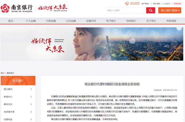 南京銀行回應(yīng)代理村鎮(zhèn)銀行清算業(yè)務(wù):不承擔(dān)資金風(fēng)險(xiǎn)