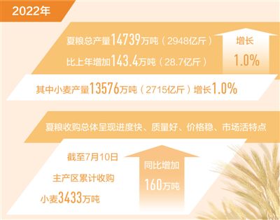 國家統(tǒng)計局7月14日發(fā)布數(shù)據(jù)顯示:2022年全國夏糧總產(chǎn)量14739萬噸(2948億斤),比上年增加143.4萬噸(28.7億斤),增長1.0%。其中,小麥產(chǎn)量13576萬噸(2715億斤),增長1.0%。