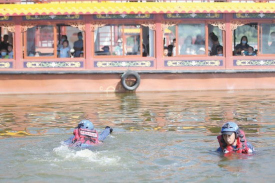 演練活動中,救援隊(duì)員下水示范,帶來直觀的教育效果。本報(bào)記者 甘南攝