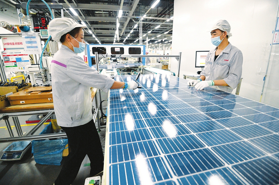 7月15日,大同隆基光伏科技有限公司光伏面板生產(chǎn)線上,工人們正在對產(chǎn)品進行最后檢測。該公司規(guī)劃布局了3條自動化生產(chǎn)線,引入目前行業(yè)內(nèi)先進的生產(chǎn)設(shè)備和技術(shù)工藝。全部建成投產(chǎn)后,預(yù)計年產(chǎn)值約30億元。(記者李兆民攝)