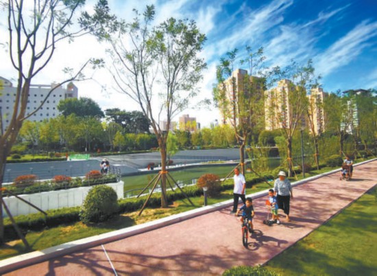 亮馬河國(guó)際風(fēng)情水岸的總面積80萬(wàn)平方米,其中可供市民休閑的公共空間就占了75%。有幼兒園的河段,建起了兒童攀爬墻,有老小區(qū)的河段,健身設(shè)施就格外多。濱河綠道從東直門外斜街一路蜿蜒至四環(huán)路,與朝陽(yáng)綠道銜接,橋下空間也打通了,沿河遛彎兒的人不必再穿行市政道路。