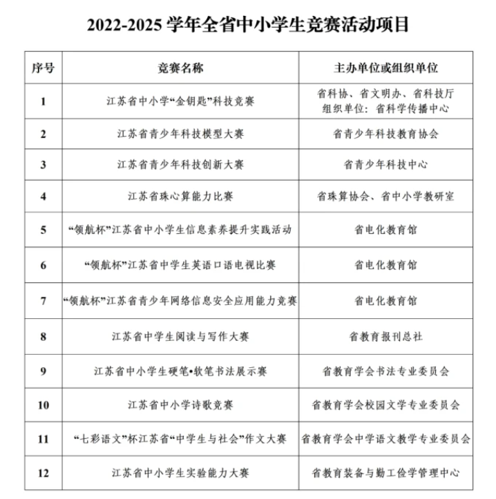 江蘇公布2022-2025學(xué)年中小學(xué)生競(jìng)賽活動(dòng)項(xiàng)目