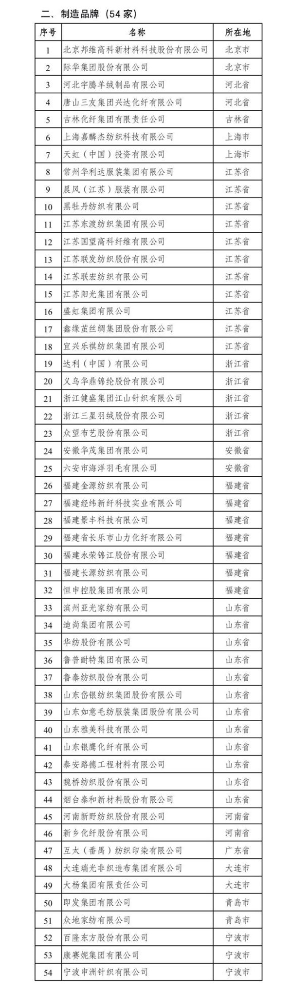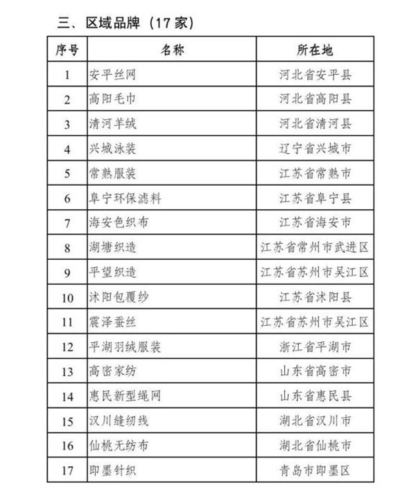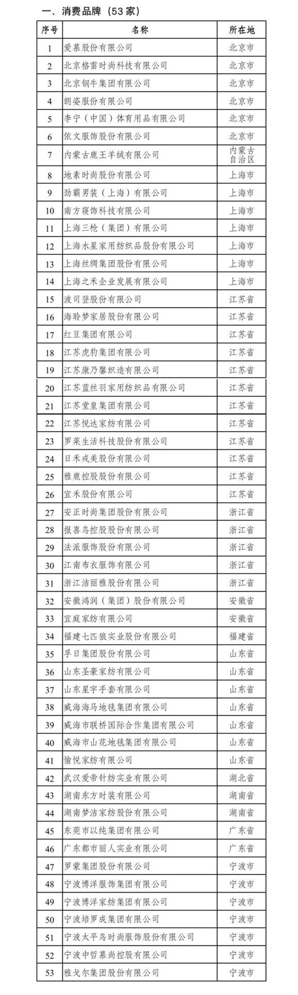 此次入選的江蘇消費品牌包括波司登、海聆夢家居、紅豆、虎豹、康乃馨、藍絲羽、堂皇、悅達家紡、羅萊、日禾戎美、雅鹿、宜禾等。制造品牌包括常州華利達、晨風、黑牡丹紡織、東渡紡織、國望高科纖維、聯發(fā)紡織、聯宏紡織、陽光、盛虹、鑫緣、宜興樂祺等。區(qū)域品牌包括常熟服裝、阜寧環(huán)保濾料、海安色織布、湖塘織造、平望織造、沭陽包覆紗、震澤蠶絲等。