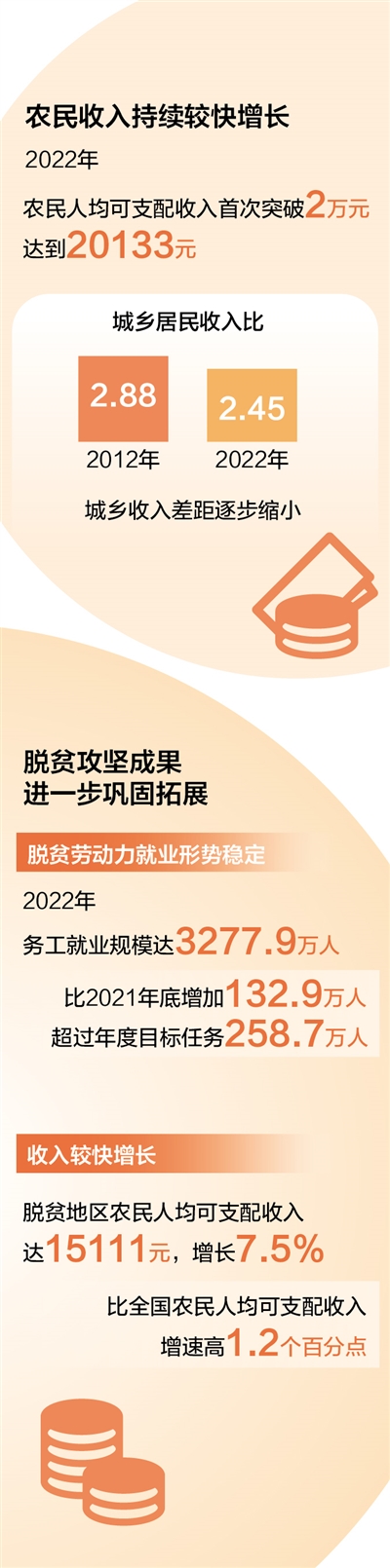 增加農(nóng)民收入是“三農(nóng)”工作的中心任務(wù)。2022年,農(nóng)民人均可支配收入首次突破2萬(wàn)元,城鄉(xiāng)居民收入比從2012年的2.88下降到2022年的2.45,城鄉(xiāng)收入差距逐步縮小?!耙惨吹?,當(dāng)前農(nóng)民收入增速有所放緩,增收動(dòng)能有所減弱。必須高度重視,拿出長(zhǎng)短結(jié)合、務(wù)實(shí)管用的硬措施,拓寬農(nóng)民增收致富渠道。”中央農(nóng)辦專職副主任、農(nóng)業(yè)農(nóng)村部黨組成員吳宏耀說(shuō)。對(duì)此,今年中央一號(hào)文件在穩(wěn)定就業(yè)、經(jīng)營(yíng)增效、挖潛財(cái)產(chǎn)收入以及拓展轉(zhuǎn)移收入等方面作出相關(guān)部署,努力讓農(nóng)民腰包越來(lái)越鼓,日子越過(guò)越紅火。