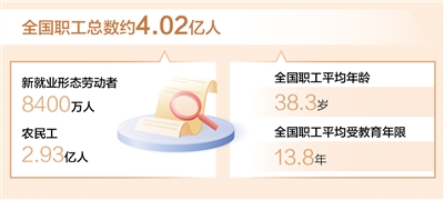 本報(bào)北京3月26日電 (記者易舒冉)記者日前從中華全國總工會(huì)獲悉:第九次全國職工隊(duì)伍狀況調(diào)查已于近期結(jié)束,調(diào)查表明,目前全國職工總數(shù)4.02億人左右,新就業(yè)形態(tài)勞動(dòng)者8400萬人,農(nóng)民工2.93億人;職工平均年齡38.3歲、平均受教育年限13.8年。調(diào)查還顯示,職工理想信念更加堅(jiān)定,主人翁地位持續(xù)鞏固,越來越多的職工積極投身“當(dāng)好主人翁、建功新時(shí)代”“建功‘十四五’、奮進(jìn)新征程”等主題勞動(dòng)和技能競賽。