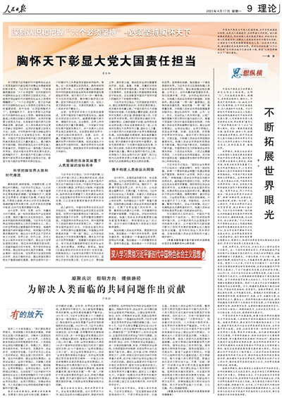 中國共產(chǎn)黨是為中國人民謀幸福、為中華民族謀復(fù)興的黨,也是為人類謀進(jìn)步、為世界謀大同的黨。我們要拓展世界眼光,深刻洞察人類發(fā)展進(jìn)步潮流,積極回應(yīng)各國人民普遍關(guān)切,為解決人類面臨的共同問題作出貢獻(xiàn),以海納百川的寬闊胸襟借鑒吸收人類一切優(yōu)秀文明成果,推動建設(shè)更加美好的世界。深刻認(rèn)識和把握“六個必須堅(jiān)持”系列理論版今天推出第六期,圍繞“必須堅(jiān)持胸懷天下”進(jìn)行闡述。