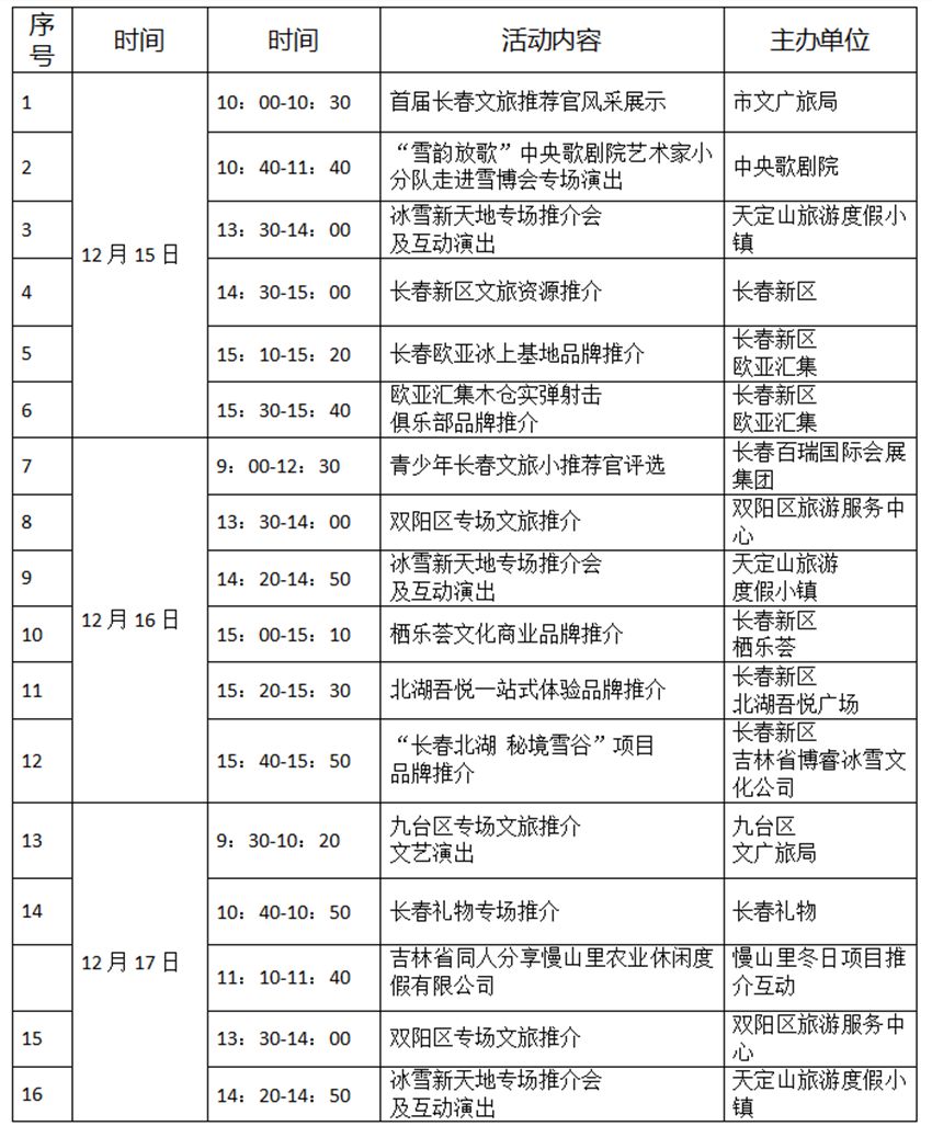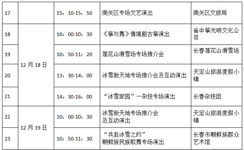 另外,12月15—19日,3號(hào)館—冰雪長春主題館各個(gè)時(shí)間段都有演出和推介活動(dòng),詳情如下: