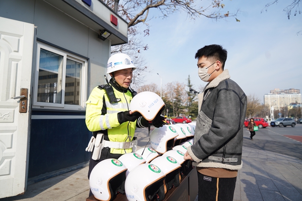 群眾在掃碼借用“共享頭盔”時(shí),系統(tǒng)自動推送交通安全宣傳提示信息,實(shí)現(xiàn)借用一次頭盔、接受一次教育。(張晉 田廷江)