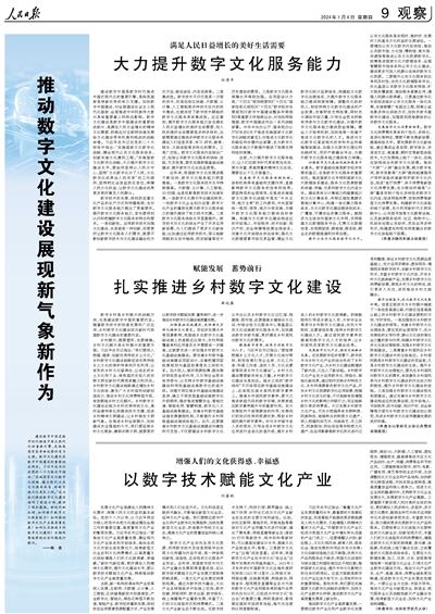 建設(shè)數(shù)字中國(guó)是數(shù)字時(shí)代推進(jìn)中國(guó)式現(xiàn)代化的重要引擎,是構(gòu)筑國(guó)家競(jìng)爭(zhēng)新優(yōu)勢(shì)的有力支撐。數(shù)字文化建設(shè)是數(shù)字中國(guó)建設(shè)的重要組成部分。習(xí)近平總書記在黨的二十大報(bào)告中指出:“實(shí)施國(guó)家文化數(shù)字化戰(zhàn)略,健全現(xiàn)代公共文化服務(wù)體系,創(chuàng)新實(shí)施文化惠民工程?!边@為我們推進(jìn)數(shù)字文化建設(shè)指明了前進(jìn)方向、提供了根本遵循。新時(shí)代新征程,如何提升數(shù)字文化服務(wù)能力?如何推動(dòng)數(shù)字文化產(chǎn)業(yè)高質(zhì)量發(fā)展?如何扎實(shí)推進(jìn)鄉(xiāng)村數(shù)字文化建設(shè)?本期觀察版圍繞這些問題進(jìn)行探討。