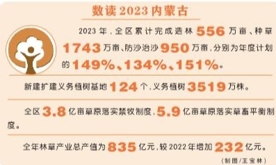 此外,2023年內(nèi)蒙古林草改革不斷深化,產(chǎn)業(yè)發(fā)展提質(zhì)提效,林草碳匯扎實(shí)推進(jìn),支撐保障顯著提升。全年林草產(chǎn)業(yè)總產(chǎn)值為835億元,較2022年增加232億元。全區(qū)新建草種繁育基地17.15萬(wàn)畝、全年制種能力有望突破500萬(wàn)公斤,預(yù)計(jì)全年飼草產(chǎn)量將達(dá)到8000萬(wàn)噸以上。(記者 霍曉慶)