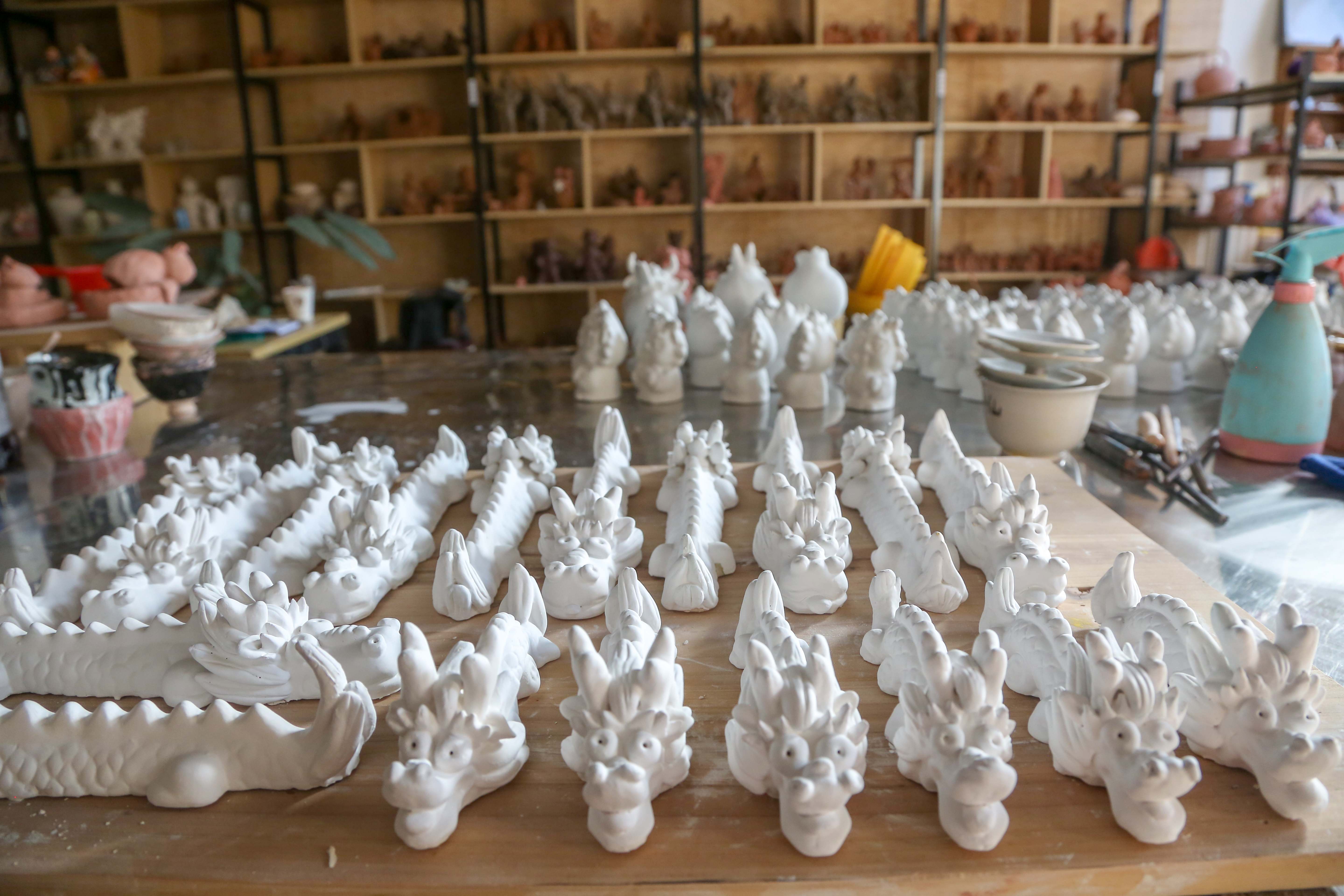 “這件泥塑取名‘一條好龍’,寓意新的一年萬事順?biāo)?;這件叫‘大嘴龍’,寓意風(fēng)調(diào)雨順;這是十二生肖龍……”隨著龍年春節(jié)的臨近,史月明創(chuàng)作了一系列以龍為主題的泥塑作品。
