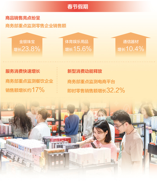數據顯示,春節(jié)假期商品銷售亮點紛呈。春節(jié)假期,節(jié)慶商品、國貨潮品、綠色智能產品等持續(xù)旺銷。商務部重點監(jiān)測零售企業(yè)金銀珠寶、體育娛樂用品、通信器材銷售額同比分別增長23.8%、15.6%和10.4%。