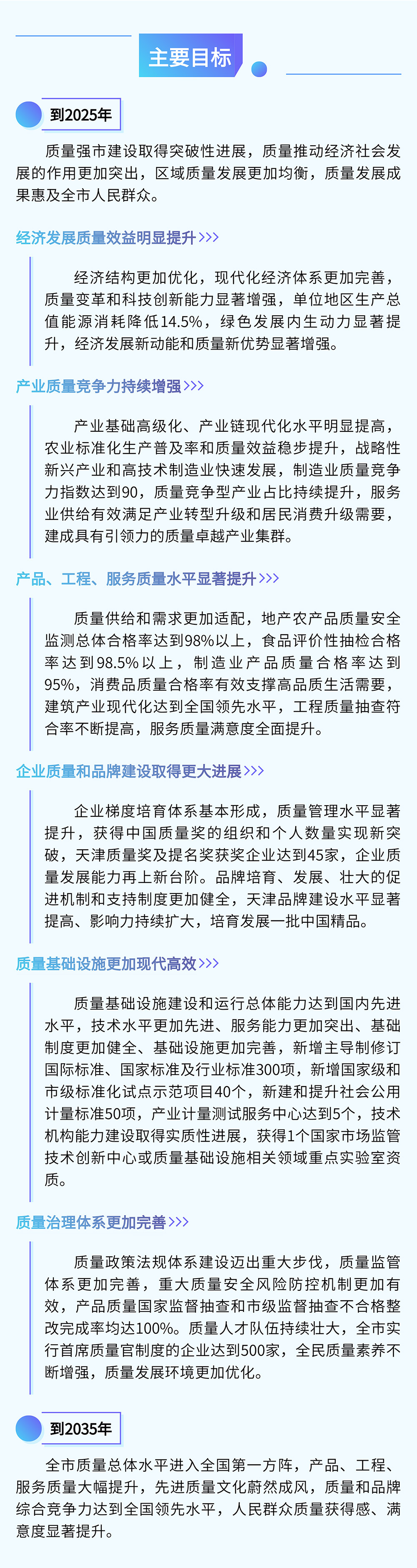 另外,《綱要》賦能中心任務,提升競爭實力?!毒V要》結合天津實際,在重點任務、工程、行動中有機融合天津特色元素。一是強化“一基地三區(qū)”建設質量賦能。提出全力推動重大科研設施和創(chuàng)新平臺建設、高標準建設海河實驗室、拓展港口國際航線網絡、大力發(fā)展科技金融、普惠金融、綠色金融、供應鏈金融等特色工作,精準定位天津在推進京津冀協(xié)同發(fā)展重大國家戰(zhàn)略中的發(fā)展坐標。二是強化制造業(yè)立市質量賦能。立足“1+3+4”現(xiàn)代工業(yè)產業(yè)體系,聚焦12條重點產業(yè)鏈,持續(xù)提升全市工業(yè)產業(yè)核心質量競爭力。提出推動信息技術應用創(chuàng)新、集成電路、車聯(lián)網3條產業(yè)鏈以鏈強業(yè),做高能級;推動生物醫(yī)藥、中醫(yī)藥、新能源、新材料4條產業(yè)鏈以鏈擴量,做大規(guī)模;推動高端裝備、汽車和新能源汽車、綠色石化、航空航天4條產業(yè)鏈以鏈提質,做優(yōu)特色;推動輕工產業(yè)鏈注重提升品牌影響力,加快數(shù)字化轉型。三是強化質量發(fā)展數(shù)字賦能、綠色支撐。圍繞經濟社會數(shù)字化、綠色化轉型發(fā)展要求,提出充分發(fā)揮綠色設計產品、綠色工廠、綠色供應鏈管理建設單位示范引領作用,持續(xù)推進綠色制造,厚植綠色發(fā)展質量根基;實施數(shù)字經濟核心產業(yè)培育和智能制造賦能工程、推進質量管理數(shù)字化建設、推動服務業(yè)企業(yè)數(shù)字化轉型,強化數(shù)字經濟質量賦能。