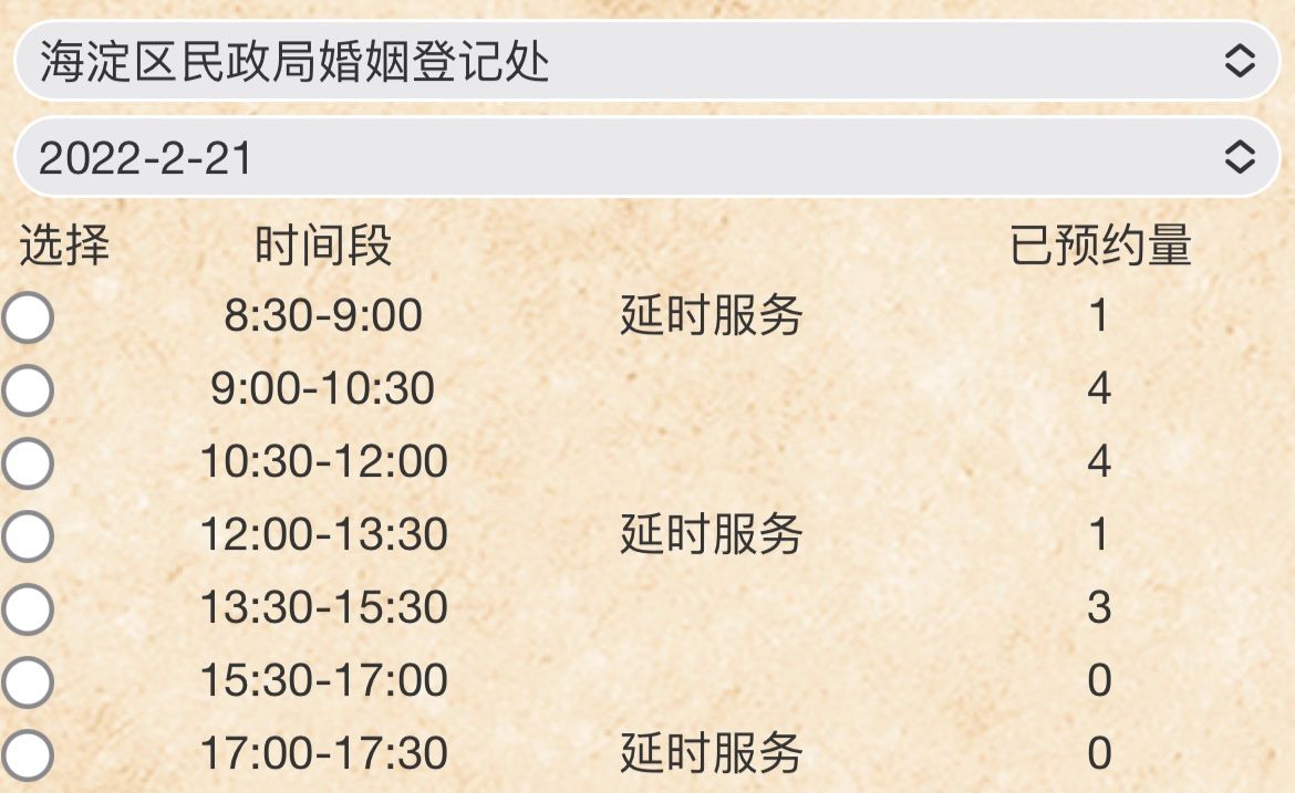 2020年9月起,北京推出政務(wù)“延時服務(wù)”,工作日除早晚提供半小時延時服務(wù)外,取消工作人員午休時間,周六延時工作一天。目前,全市婚登服務(wù)從8時30分持續(xù)至17時30分,全天分為7個預(yù)約時段。截至記者發(fā)稿時,東城、西城、朝陽、海淀、順義、大興等多區(qū)僅剩兩個時段還可預(yù)約。