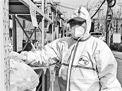 4月7日一早,在望京西園三區(qū)北門附近的管控區(qū)硬質(zhì)隔離圍欄內(nèi),小區(qū)物資配送小組工作人員正忙著將當(dāng)日的居民物資、快遞等進(jìn)行登記、分揀和消毒。隨后這些物資被分別送往每棟樓下的快遞架,再通知居民下樓自取。