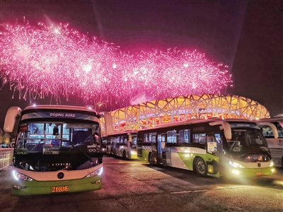 2月4日晚,北京冬奧會(huì)開幕式焰火與保障車輛“同框”。本版圖片/北京市交通委員會(huì)供圖