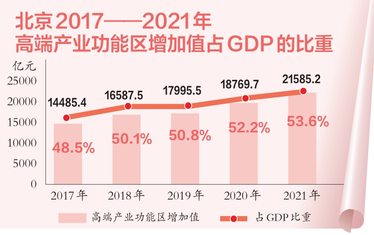 重點功能區(qū)呈現(xiàn)集聚效應(yīng)。中關(guān)村國家自主創(chuàng)新示范區(qū)等高端產(chǎn)業(yè)功能區(qū)占據(jù)全市經(jīng)濟(jì)總量的半壁江山,2021年實現(xiàn)增加值2.2萬億元,占全市GDP的53.6%,比2016年提高5.3個百分點。