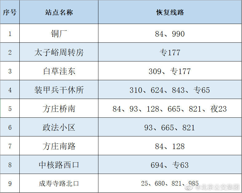 央廣網(wǎng)北京6月16日消息 據(jù)北京公交集團官博消息,按照防疫工作要求,自2022年6月16日首班車起,對前期途經(jīng)昌平區(qū)封管控區(qū)域周邊采取甩站措施的35條線路以及前期途經(jīng)豐臺區(qū)封管控區(qū)域周邊采取甩站措施的18條線路,恢復正常運營,恢復信息詳見下表。