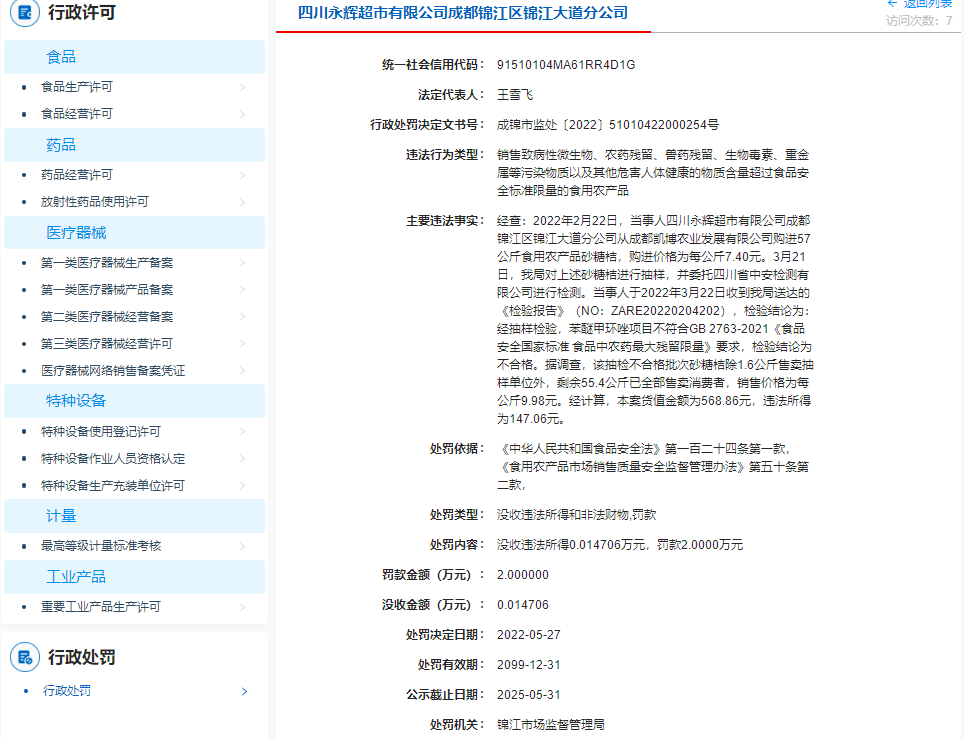 處罰決定文書(shū)顯示,經(jīng)查,2022年2月22日,當(dāng)事人四川永輝超市有限公司成都錦江區(qū)錦江大道分公司從成都凱博農(nóng)業(yè)發(fā)展有限公司購(gòu)進(jìn)57公斤食用農(nóng)產(chǎn)品砂糖桔,購(gòu)進(jìn)價(jià)格為每公斤7.40元。當(dāng)事人銷(xiāo)售的砂糖桔經(jīng)抽樣檢驗(yàn),苯醚甲環(huán)唑項(xiàng)目不符合GB 2763-2021《食品安全國(guó)家標(biāo)準(zhǔn) 食品中農(nóng)藥最大殘留限量》要求,檢驗(yàn)結(jié)論為不合格。據(jù)調(diào)查,該抽檢不合格批次砂糖桔除1.6公斤售賣(mài)抽樣單位外,剩余55.4公斤已全部售賣(mài)消費(fèi)者,銷(xiāo)售價(jià)格為每公斤9.98元。經(jīng)計(jì)算,本案貨值金額為568.86元,違法所得為147.06元。