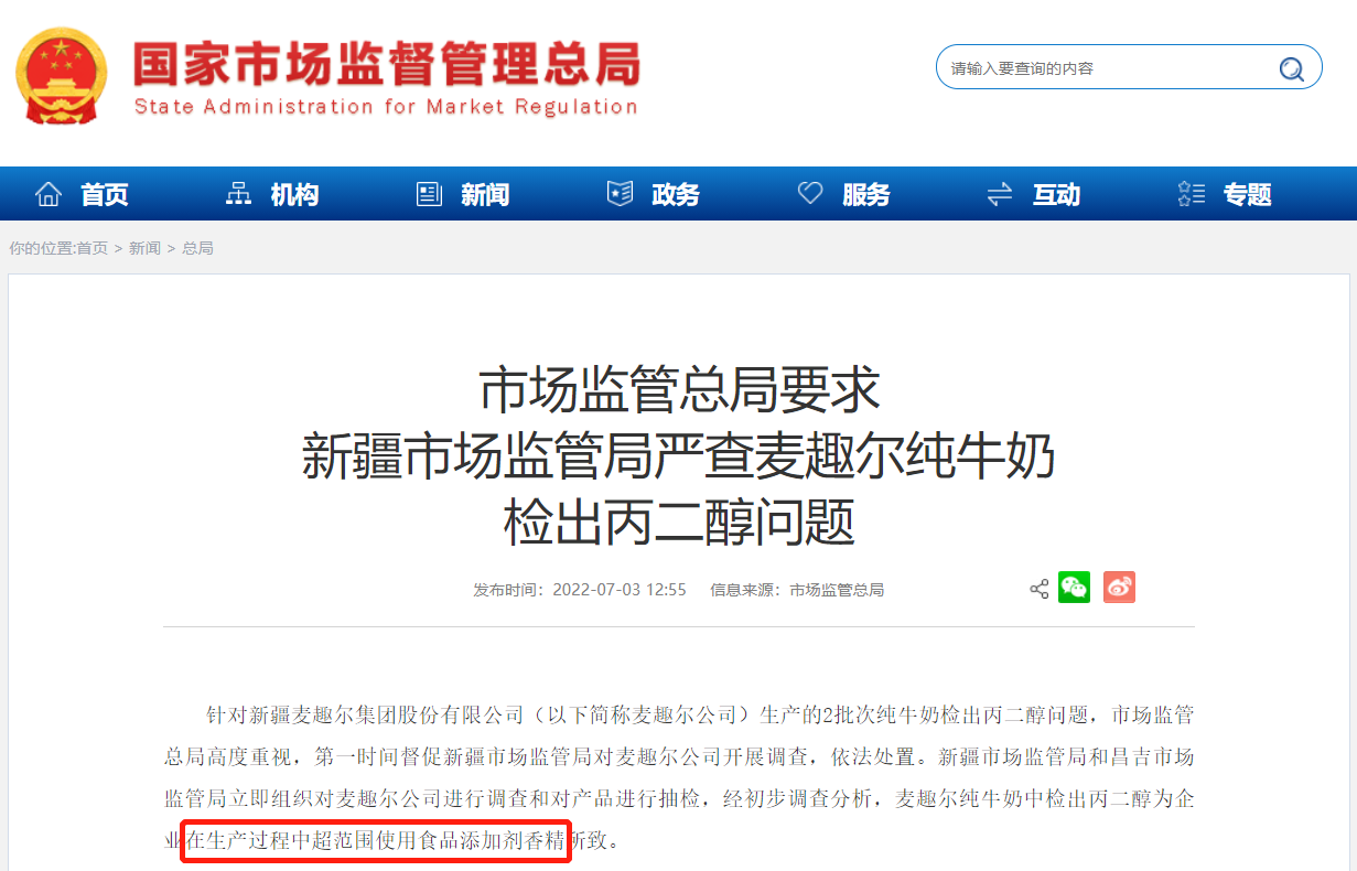 7月3日,國(guó)家市場(chǎng)監(jiān)管總局發(fā)布消息,要求“嚴(yán)查麥趣爾純牛奶檢出丙二醇問題”,并表示“經(jīng)初步調(diào)查分析,麥趣爾純牛奶中檢出丙二醇為企業(yè)在生產(chǎn)過程中超范圍使用食品添加劑香精所致?!?/p>