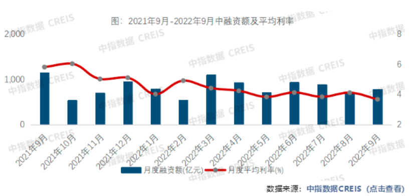 銷售業(yè)績有所回暖的同時,房企面臨的資金壓力也在有所緩解。數(shù)據(jù)顯示,9月房企融資平均利率同比出現(xiàn)下降,信用債發(fā)行出現(xiàn)回暖跡象。據(jù)中指研究院監(jiān)測,2022年9月房地產(chǎn)企業(yè)非銀融資總額為777.9億元,同比下降32.2%,環(huán)比上升13.3%,融資形勢稍有好轉(zhuǎn)。行業(yè)平均利率為3.67%,同比下降2.14個百分點,環(huán)比下降0.44個百分點。