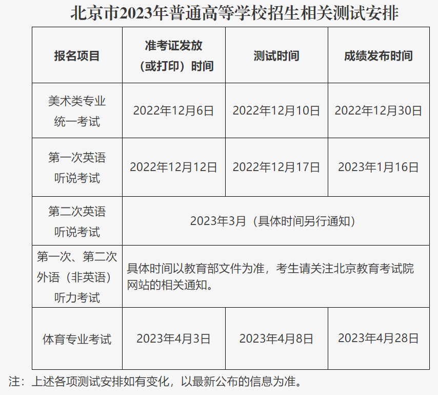 ?。ㄋ模?023年普通高等學(xué)校招生美術(shù)類專業(yè)統(tǒng)一考試、體育專業(yè)考試、英語聽說考試、外語(非英語)聽力考試報名與高考報名同期進行,符合條件擬報名參加相關(guān)測試的考生須選報相關(guān)項目并繳費。