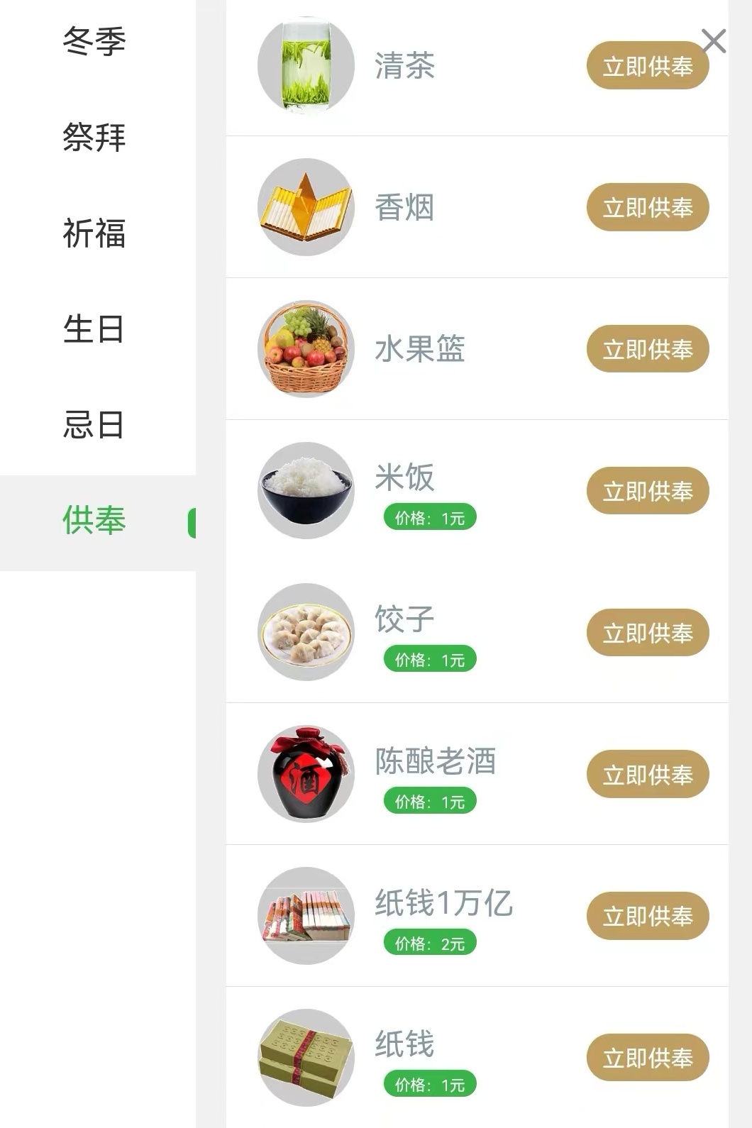 記者發(fā)現(xiàn),用戶免費(fèi)創(chuàng)建“網(wǎng)上紀(jì)念館”后,可以在紀(jì)念館進(jìn)行“祭拜、祈福、獻(xiàn)花、供奉”等虛擬活動(dòng)。而在推出的這些虛擬服務(wù)中,有些是免費(fèi)的,有些則要收取費(fèi)用。比如,在某平臺(tái)送出一個(gè)“生日快樂(lè)”蛋糕,需要微信支付2元,送一疊“忌日紙錢(qián)”需要支付1元,一份“米飯”1元。