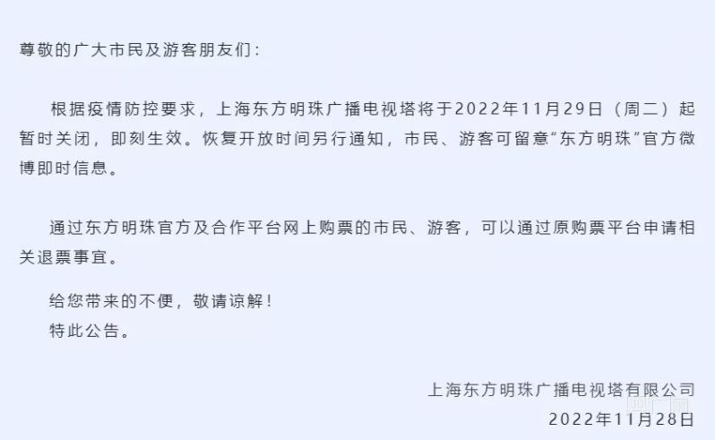 上海東方明珠廣播電視塔有限公司28日晚發(fā)布公告稱,根據(jù)疫情防控要求,上海東方明珠廣播電視塔于2022年11月29日起暫時關(guān)閉,即刻生效?;謴?fù)開放時間另行通知,市民、游客可留意“東方明珠”官方微博即時信息。