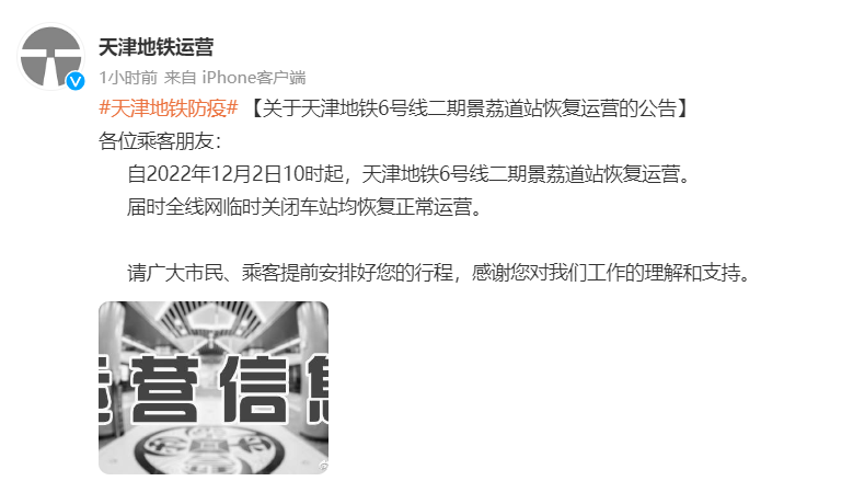 12月2日起天津地鐵全線網(wǎng)臨時關(guān)閉車站均恢復(fù)運營