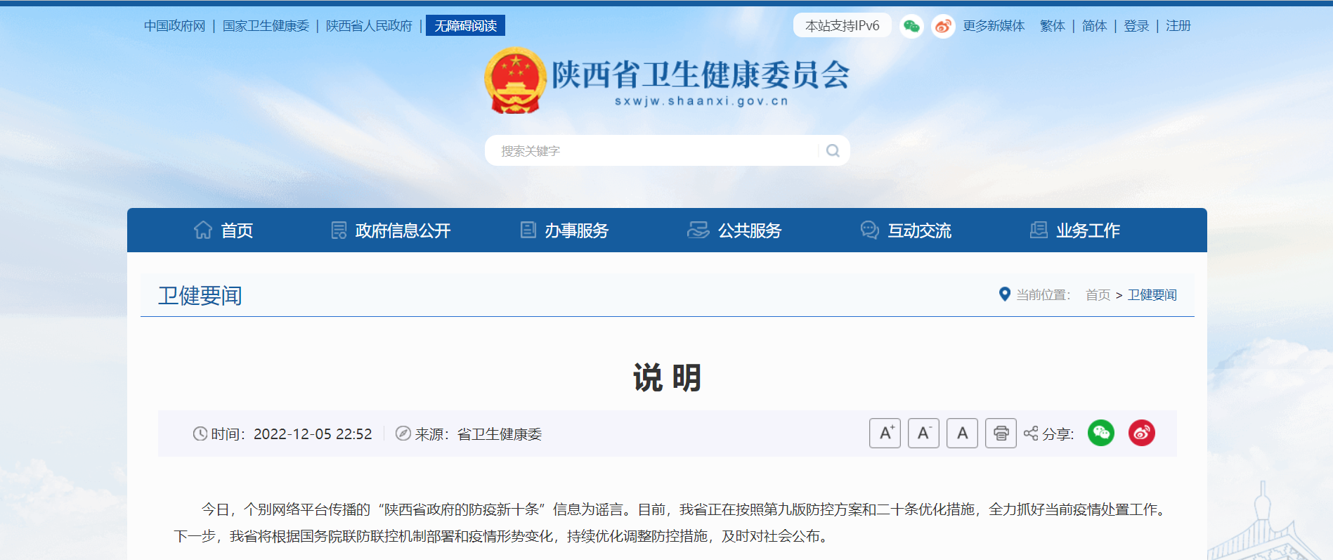 央廣網(wǎng)西安12月6日消息(見習記者侯凱奇)12月5日晚,陜西省衛(wèi)健委官網(wǎng)發(fā)布說明,明確提出個別網(wǎng)絡(luò)平臺傳播的“陜西省政府的防疫新十條”信息為謠言。