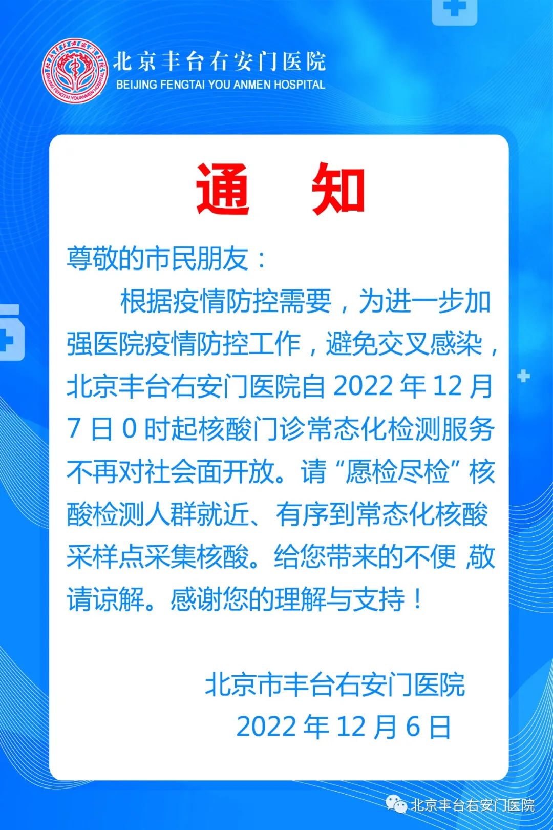 12月6日,北京豐臺右安門醫(yī)院發(fā)布核酸門診停診通知。其中提到,12月7日起核酸門診常態(tài)化檢測服務(wù)不再對社會面開放。