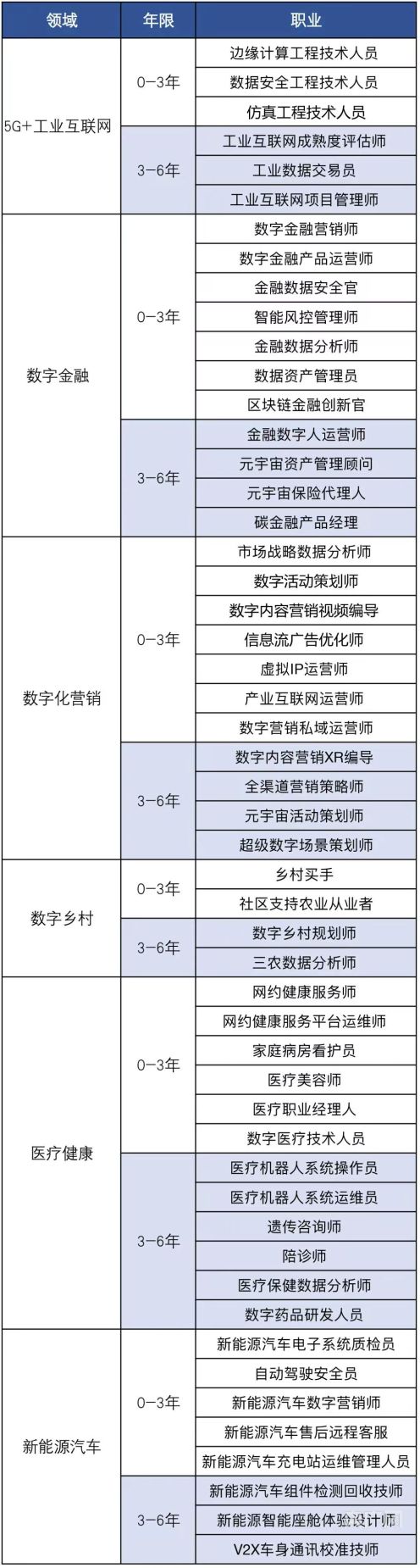 此次發(fā)布的52個未來職業(yè)“高清畫像”,涉及涵蓋醫(yī)療健康、5G+工業(yè)互聯網、數字化營銷、數字金融、數字鄉(xiāng)村、新能源汽車等六大領域,依據發(fā)展成熟度分為0-3年與3-6年兩個階段,既可以看到新技術、新業(yè)態(tài)和新模式場景下,原有職業(yè)內涵發(fā)生變化的更新性職業(yè),也可以看到全新職業(yè)類型,不僅明確了職業(yè)定義,細化了主要工作任務,更進一步列出了具體技能要求清單。