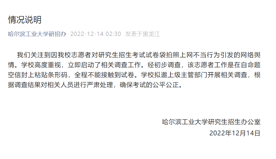 央廣網(wǎng)哈爾濱12月14日消息(記者馬俊瑋)12月14日,哈爾濱工業(yè)大學(xué)研究生招生辦公室通報(bào):我們關(guān)注到因我校志愿者對(duì)研究生招生考試試卷袋拍照上網(wǎng)不當(dāng)行為引發(fā)的網(wǎng)絡(luò)輿情。學(xué)校高度重視,立即啟動(dòng)了相關(guān)調(diào)查工作。經(jīng)初步調(diào)查,該志愿者工作是在自命題空信封上粘貼條形碼,全程不能接觸到試卷。學(xué)校擬邀上級(jí)主管部門開展相關(guān)調(diào)查,根據(jù)調(diào)查結(jié)果對(duì)相關(guān)人員進(jìn)行嚴(yán)肅處理,確保考試的公平公正。