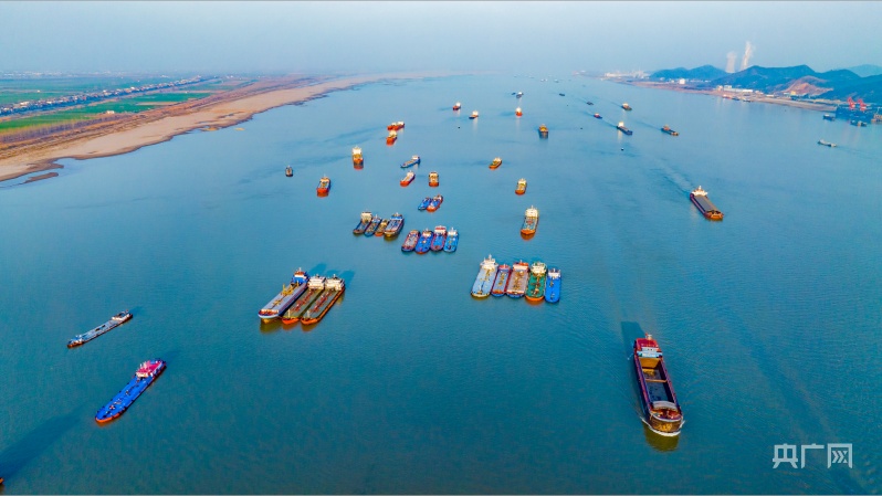 長(zhǎng)江航道江西省九江市湖口縣水域船舶往來(lái)穿梭,水運(yùn)一派繁忙(央廣網(wǎng)發(fā) 余杰 攝)