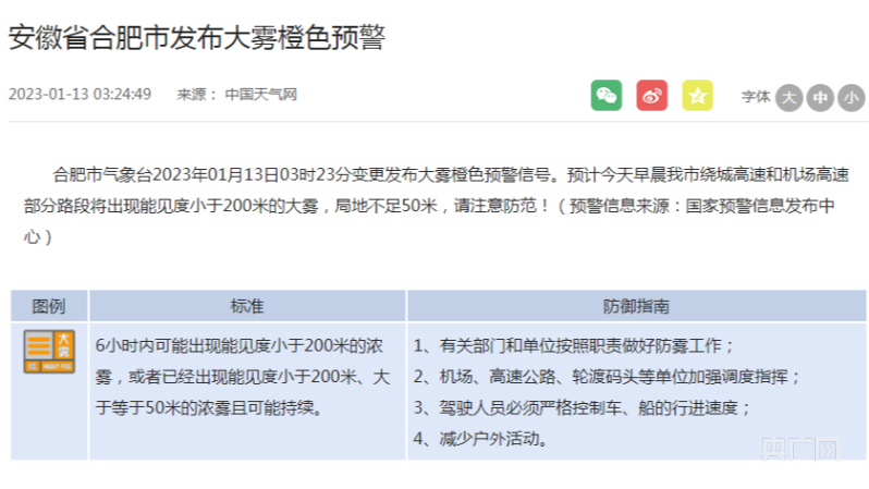 大霧預(yù)警信號(hào)變更(央廣網(wǎng)發(fā) 圖片來源安徽省氣象局官網(wǎng))