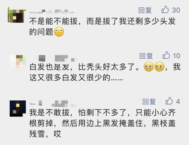 一些人在壓力較大時(shí),可能會(huì)將疼痛感轉(zhuǎn)化為某種獲得感,在一定程度上緩解焦慮。但更多人是從拔白頭發(fā)這件事當(dāng)中獲得一種視覺上的自信——似乎又回到了頭發(fā)烏黑的時(shí)代。
