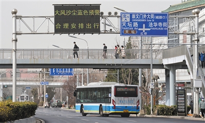 3月22日,天壇路,電子顯示屏提示,大風(fēng)沙塵藍色預(yù)警,合理安排出行。新京報記者 王飛 攝