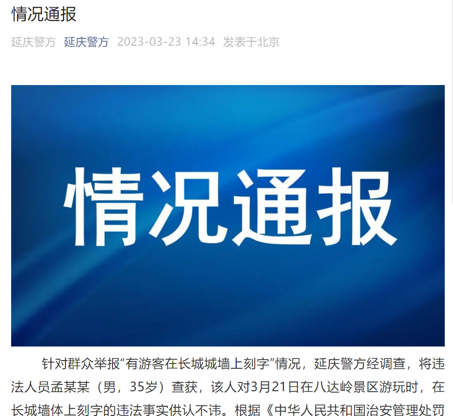 央廣網(wǎng)北京3月23日消息 據(jù)延慶警方微信公眾號3月23日情況通報, 針對群眾舉報“有游客在長城城墻上刻字”情況,延慶警方經(jīng)調查,將違法人員孟某某(男,35歲)查獲,該人對3月21日在八達嶺景區(qū)游玩時,在長城墻體上刻字的違法事實供認不諱。根據(jù)《中華人民共和國治安管理處罰法》有關規(guī)定,延慶警方已對孟某某處以行政拘留并處罰款的處罰。