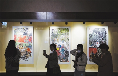 4月5日,游客在景山公園看《印象中軸 京城記憶——紫禁之巔系列馬海方書畫藝術(shù)展》。新京報(bào)記者 薛珺 攝