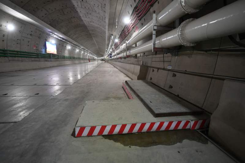 此外,箱涵兩側(cè)分別設(shè)置有管廊與人員應(yīng)急通道,而這些在路面鋪設(shè)完畢后都將藏于路面下方,對(duì)通行者來說完全是無感的。孫長(zhǎng)松指著路面上的一處蓋有擋板的地方告訴記者,這里就是人員應(yīng)急通道的入口,通車后路面上將設(shè)置用液壓控制的智能蓋板,正常狀態(tài)下,它與路面嚴(yán)絲合縫地貼在一起,在發(fā)生意外情況、需要疏散人員時(shí),它則會(huì)及時(shí)開啟。