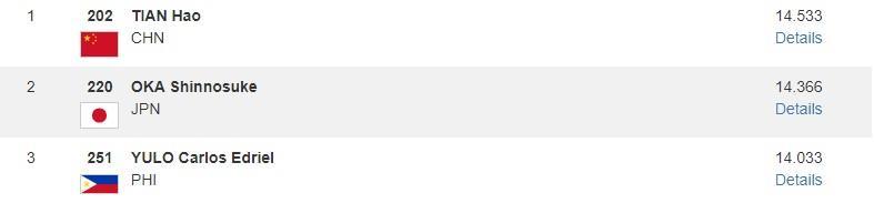 男子雙杠項目,尹德行以15.100分收獲銅牌,另一名中國選手蘭星宇以12.733分排名第七。