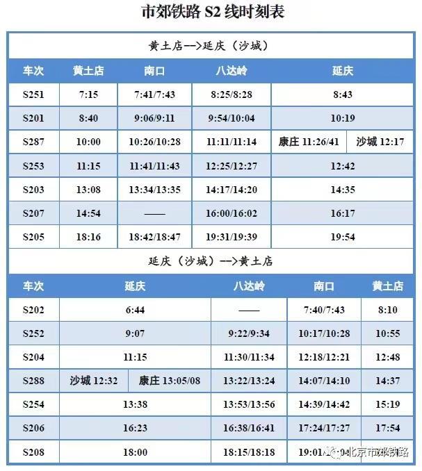 記者從北京市郊鐵路官微獲悉,為滿足“端午”假日期間市民出行需求,6月21日至6月22日期間,S2線每日開行7對列車。列車開行時刻如下圖所示: