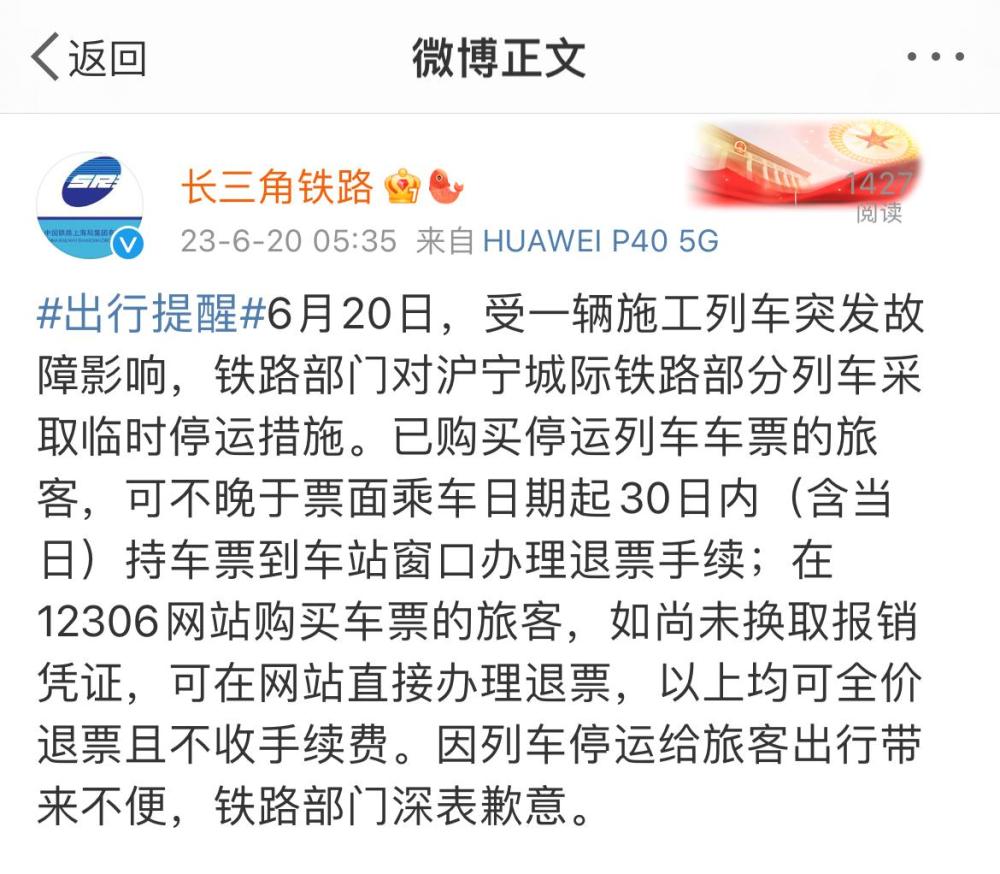 記者6月20日從鐵路上海局獲悉,受一輛施工列車突發(fā)故障影響,鐵路部門對(duì)滬寧城際鐵路部分列車采取臨時(shí)停運(yùn)措施。已購(gòu)買停運(yùn)列車車票的旅客,可不晚于票面乘車日期起30日內(nèi)(含當(dāng)日)持車票到車站窗口辦理退票手續(xù);在12306網(wǎng)站購(gòu)買車票的旅客,如尚未換取報(bào)銷憑證,可在網(wǎng)站直接辦理退票,以上均可全價(jià)退票且不收手續(xù)費(fèi)。