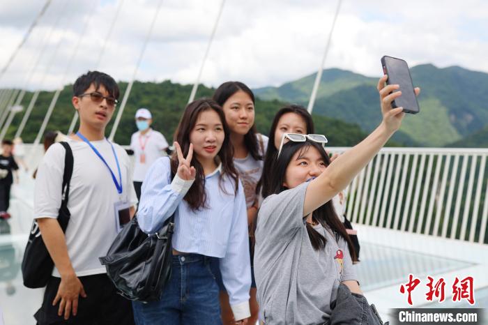 7月3日至8日,2023年全國臺聯(lián)第二十屆臺胞青年千人夏令營湖南分營舉行。圖為臺胞青年“打卡”張家界玻璃橋。 鄭和澤 攝