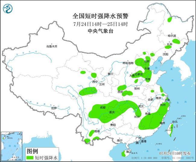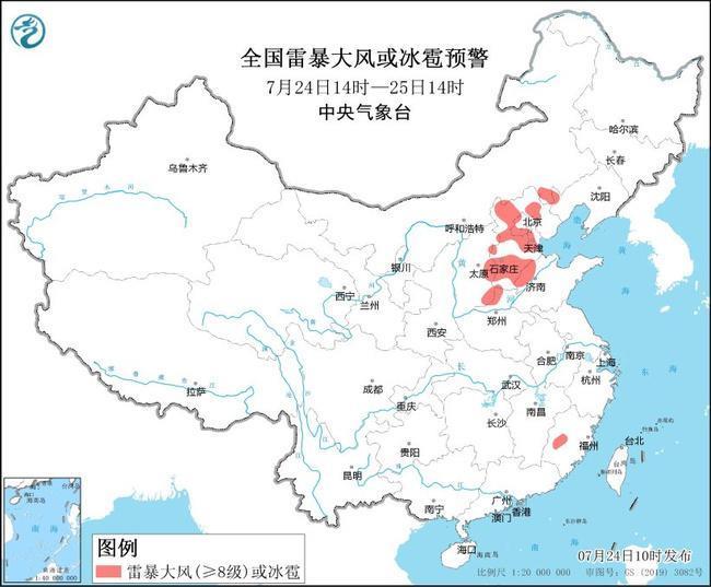 預(yù)計7月24日14時至25日14時,山西東部、河北大部、北京西部和東南部、天津中西部和南部、山東北部、河南西北部、福建西北部等地的部分地區(qū)將有8級-10級雷暴大風或冰雹天氣;黑龍江西北部、吉林中東部、遼寧北部和西南部、青海東部、甘肅西南部、陜西中東部、山西東部、河北大部、北京大部、天津、山東中北部、河南西部、江蘇中部、上海東南部、湖北西南部、湖南北部、江西中南部、浙江、福建、四川中南部、重慶、貴州北部、云南中南部、廣東東北部、海南島西南部、臺灣島東部等地的部分地區(qū)將有短時強降水天氣,小時雨量30-50毫米,局地可達70毫米以上。
