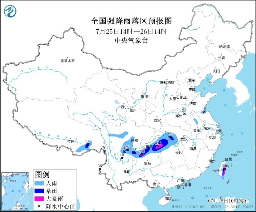 預計,7月25日14時至26日14時,西藏東南部、云南西部和東北部、四川西部和南部、貴州北部、重慶東部、湖北西南部、湖南西北部以及臺灣島東部等地有大到暴雨,其中,貴州西北部、重慶東南部、湖南西北部和臺灣島東部等地的部分地區(qū)有大暴雨(100~200毫米);上述部分地區(qū)伴有短時強降水(最大小時降雨量20~50毫米,局地可超過80毫米),局地有雷暴大風等強對流天氣。