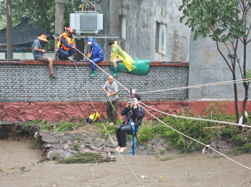 現(xiàn)場(chǎng),水已經(jīng)漫過(guò)被困人員所處的房屋屋頂,5名群眾被困在高處的墻頭,其中還有1名兒童。消防救援人員到場(chǎng)后,迅速利用繩索搭建救援通道。15分鐘后,繩橋架設(shè)完畢,消防救援人員對(duì)被困群眾展開(kāi)救援。14時(shí)10分左右,救援任務(wù)成功完成,被困群眾均被轉(zhuǎn)移到安全地點(diǎn)。